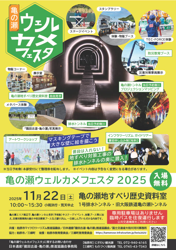 亀の瀬エリア周辺で、普段予約必須な亀の瀬トンネルや地すべり対策工事用トンネルの自由見学やステージイベント、飲食ブース、特別パネル展などに加え、お子様に人気...