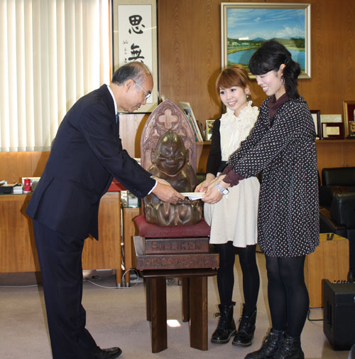 柏原市を拠点にコンサート活動などを行っている「通天交響楽団(紹介ページへ・別ウインドウ開きます)」と2代目ビリケンさんが、10月24日に大槌町を表敬訪問することに合わせ、同協議会は義援金(目録)を託し、同町まで届けてもらいました。なお、訪問当日にビリケンさんが一日大槌町長に就任し、通天交響楽団によるミニライブが実施されました。