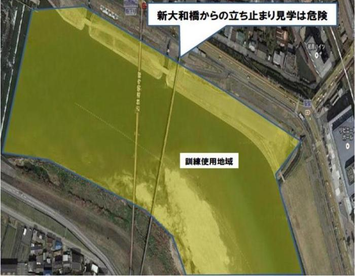 危険ですので、新大和橋での立ち止まっての見学や下図の訓練区域への立ち入りはご遠慮ください。