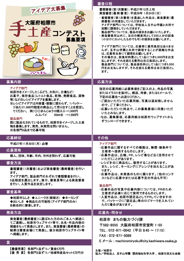 柏原市の「おみやげ」として名物になる新商品開発のアイデアと、前からあるけれど、もっとみんなに知ってほしい「おみやげ」のコンテストを開催します。